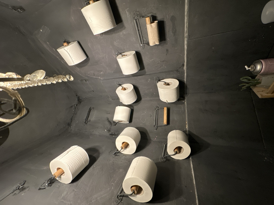 n odd, claustrophobic space, likely a bathroom, with black walls and numerous toilet paper rolls mounted in a haphazard manner