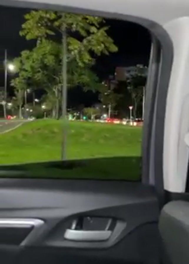The video is taken from inside a car, with the view out of the passenger side window visible. It is nighttime. Outside, there is a grassy area with trees and streetlights. Cars can be seen driving in the distance. The window is slightly open, and the car's door handle and seat are visible inside. The video gives the impression of someone driving past a park or green space at night.