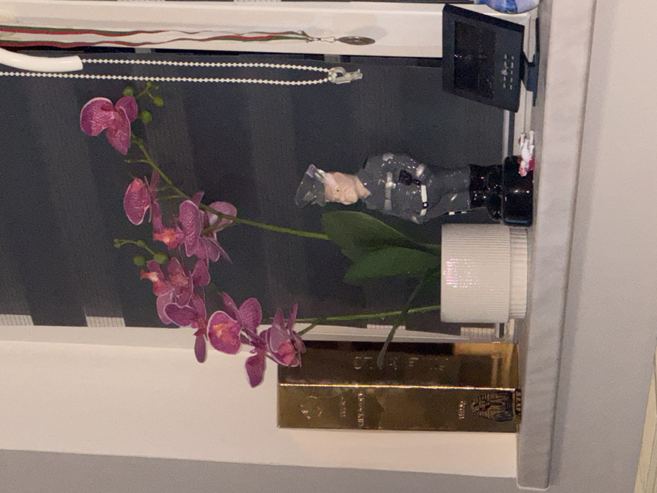 The image displays an indoor scene on a windowsill in Sofia, Bulgaria. Arranged on the white, flat windowsill, from left to right, are several objects. On the far left, a tall, reflective gold-colored bar replica stands upright, bearing markings including "1000g" and an Egyptian-style relief at its base. Next to it, a white, ribbed ceramic pot holds a potted plant featuring multiple stems with vibrant purple artificial orchid flowers and green leaves. To the right of the plant, a ceramic figurine of a stout male figure in a gray uniform with white accents and a clear peaked cap stands on a dark base. Directly in front of the figurine, a small, crumpled white and red object rests on the sill. Further right, a small, black digital photo frame or monitor with a dark screen and several buttons is positioned. On the far right, a small, white and blue patterned ceramic container is visible. In the background, a window with dark horizontal blinds is present. A white beaded chain and two hanging decorative items—a multi-colored ribbon and a pendant—are visible on the right side, suspended near the window frame. The scene is illuminated, casting reflections on the objects.