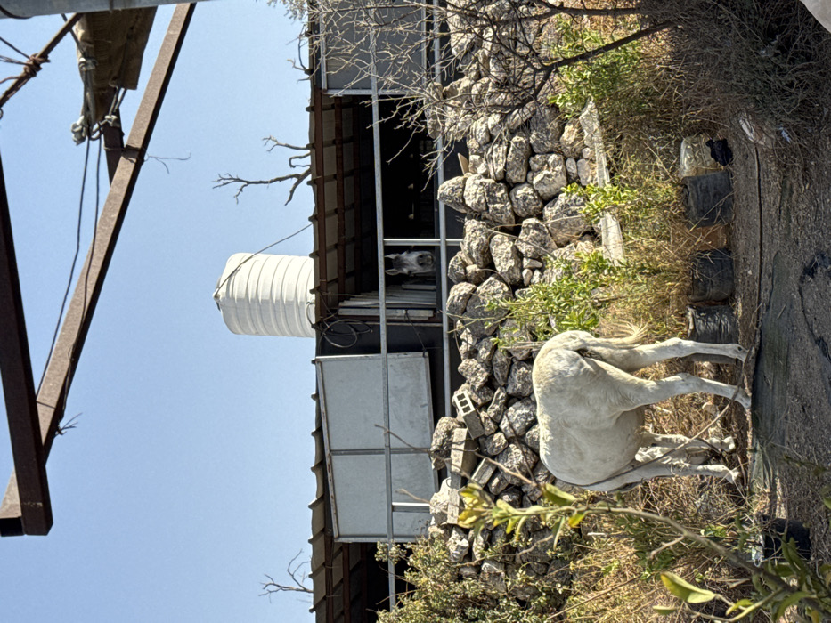 The image displays an outdoor scene in Jerusalem, Israel, under a clear blue sky. In the foreground, a light-colored equine, identified as a donkey or mule, stands with its hindquarters facing the viewer and its head directed downwards towards the ground. A light-colored rope is visible near its front legs. The ground consists of sparse vegetation, including several small potted plants in dark containers, and exposed soil. A dry-stacked stone wall serves as a barrier in the midground. Behind this wall, a stable-like structure with a corrugated metal roof is present. The head of a light-colored horse is visible looking out from an open section of this structure. In the upper background, a white, cylindrical water tank stands against the clear sky, flanked by several bare tree branches. A rusty metal beam extends horizontally across the top portion of the frame.