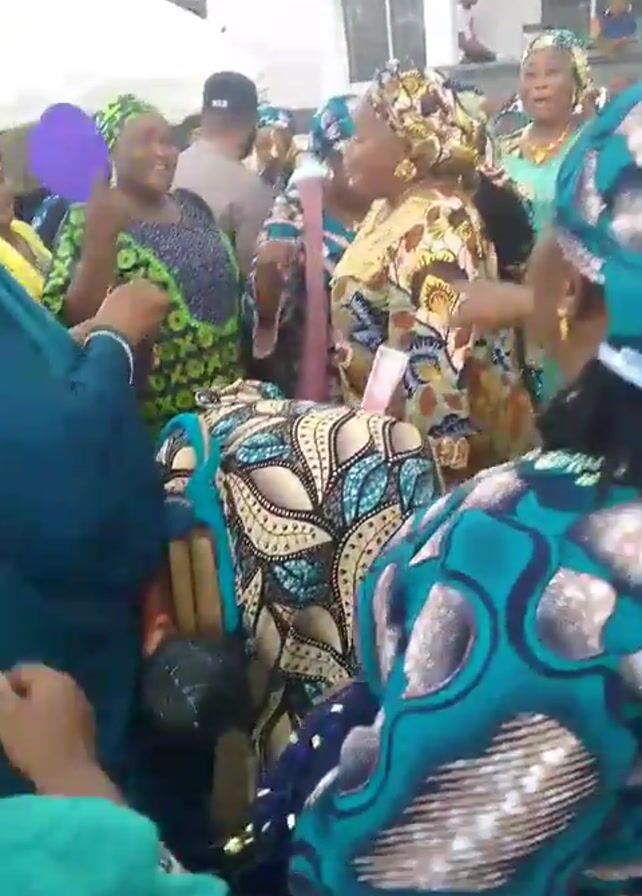 A gathering of several women in colorful patterned dresses and head wraps dance outdoors in front of a white building. Most women appear to be singing or chanting. One woman waves a purple fan. The ground is visible, and appears to be paved. A white umbrella is seen. Several men are visible behind the dancing women.
