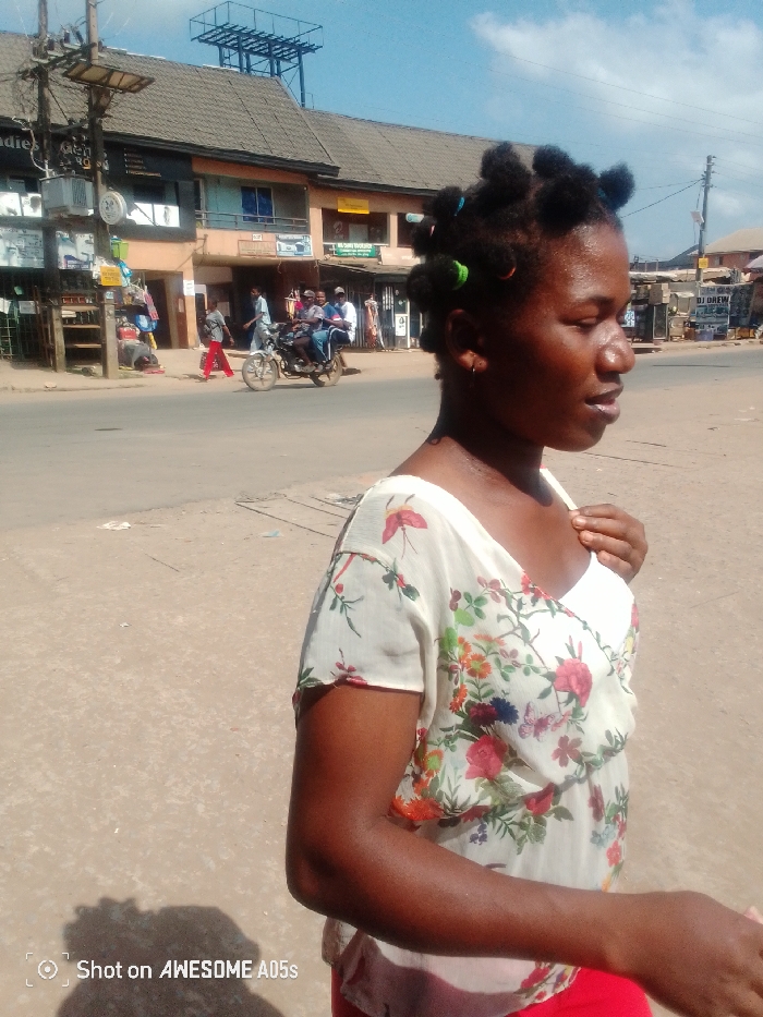 A woman in a floral blouse and red pants stands in a street. She has dark skin and her hair is styled in small buns secured with colorful hair ties. In the background, there is a two-story building with shops and apartments and a group of people on a motorcycle. The street appears to be a busy thoroughfare with other vehicles and pedestrians present. The sky is clear and the scene is bathed in natural daylight.