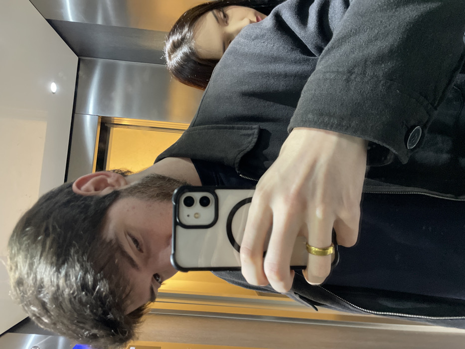 The image displays two individuals inside what appears to be an elevator, characterized by reflective, polished metallic walls and doors. A male subject occupies the foreground, shown from the chest up. He has dark brown hair and a beard, and is wearing a dark-colored, collared jacket over a dark garment. He holds a white-cased smartphone, an iPhone model with visible dual cameras and a circular MagSafe ring on the case, in his right hand, which is prominently featured. A plain gold-colored ring is present on his right ring finger. His head is tilted downwards, and his eyes are directed towards the phone. Partially visible behind his right shoulder is a second individual, a female, with dark hair. Only the right side of her face, including an eye and a portion of her mouth with red lipstick, is discernable, with her gaze directed downwards and to her right. The background reflects a warm, possibly yellowish light source, and a recessed ceiling spotlight is also visible in the reflection. The specific location within the city of Cachan, France, is not identifiable from the interior elevator setting depicted.