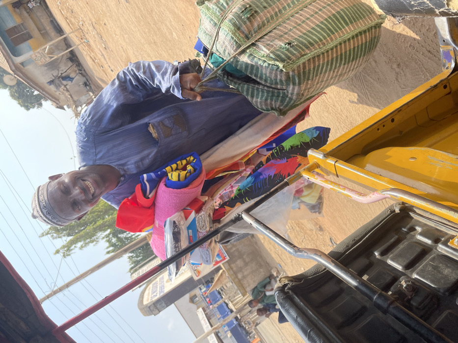 The image depicts an outdoor street scene in Zongon Daji, Nigeria, captured from the interior of a yellow auto-rickshaw. A dark-skinned adult male, approximately middle-aged, stands centrally, facing the camera and smiling broadly. He wears a light blue traditional tunic with a patterned breast pocket containing currency notes, and a patterned cap. He is holding a large, vertically striped green and beige woven bag in his right hand. Against his left side, he carries multiple textile items, including a rolled pink towel, a rolled yellow and blue patterned towel, various folded fabrics in plastic packaging, and a vibrant multi-colored fabric with a feather motif. The ground is unpaved, dusty earth. In the background to the left, a white sign with blue lettering partially visible as "D-S OF NIGERIA SCHOOL COMPLEX" is present, along with utility poles and two individuals seated on the ground. To the right, a light-colored building with a brown signpost and a distant satellite dish are visible. The sky is clear and light blue.