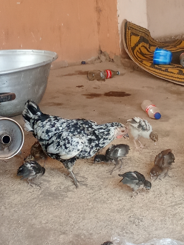 The scene depicts an outdoor or semi-enclosed area in Akwanga, Nigeria. A mottled black and white adult chicken is present, surrounded by approximately seven chicks of varying dark plumage, including black, brown, and speckled grey/white. The birds are actively foraging, pecking at scattered light-colored grain or feed covering the light brown, possibly concrete or packed earth ground. In the left foreground, a large, silver-colored metallic bowl is partially visible. To its lower right, a silver metallic object, resembling a funnel, is also partially visible. The background consists of a plain, light orange-brown wall showing signs of discoloration and minor surface irregularities. This wall meets another at a corner on the right side of the frame. On the ground near the corner, two clear plastic bottles are observed: one with a red Coca-Cola label, and another with a blue cap and no discernible label. A dark blue plastic cup or container rests on a woven mat, partially visible against the wall in the upper right. The mat features a dark brown and yellow/beige geometric pattern. No human subjects are present.