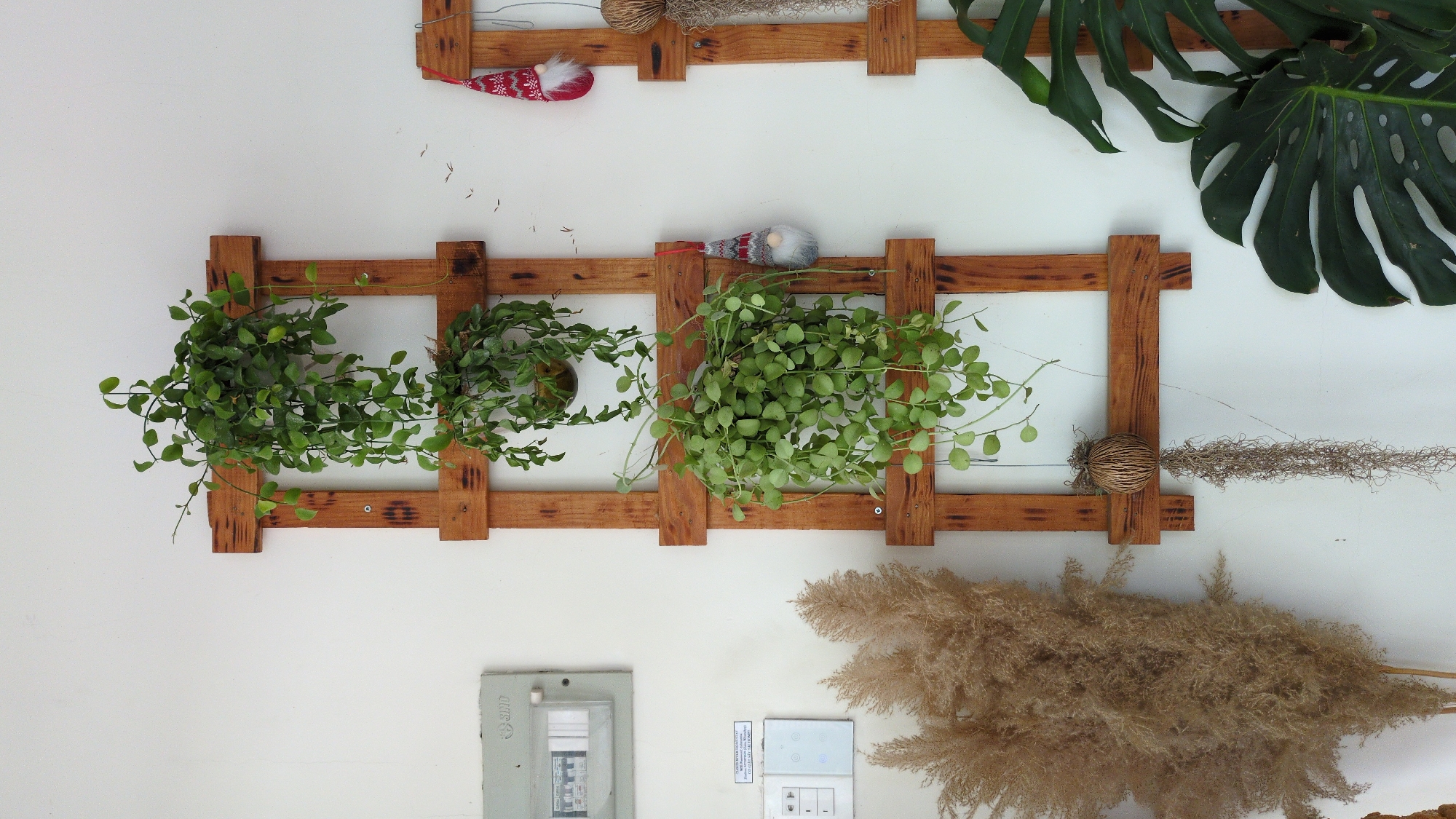 white wall decorated with three wooden frames arranged vertically. Each frame is constructed from a series of horizontal and vertical wooden pieces, forming a lattice-like structure. The frames contain various decorations. The middle and lower frames hold small potted plants with trailing green vines. Additionally, two gnome-like ornaments with pointed hats are affixed to the top frame. A decorative ball of string and moss hangs on the top frame, along with trailing strands of Spanish moss. A large Monstera leaf is positioned on the top-right corner of the image. A cluster of dried pampas grass plumes is at the bottom-right corner. An electrical panel and a series of light switches are visible on the lower-left side of the wall. The location is Cam Ly - Đà Lạt, Vietnam.