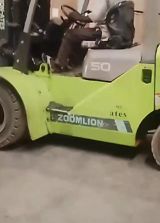 A light green Zoomlion forklift is driven indoors on a gray concrete floor. A person wearing a white shirt and brown pants operates the vehicle, which has a black seat. The forklift passes by a stack of cardboard boxes to the driver's right. The words "ZOMLION" are partially visible on the left side of the forklift. The video is shot from a low angle and follows the forklift as it moves.