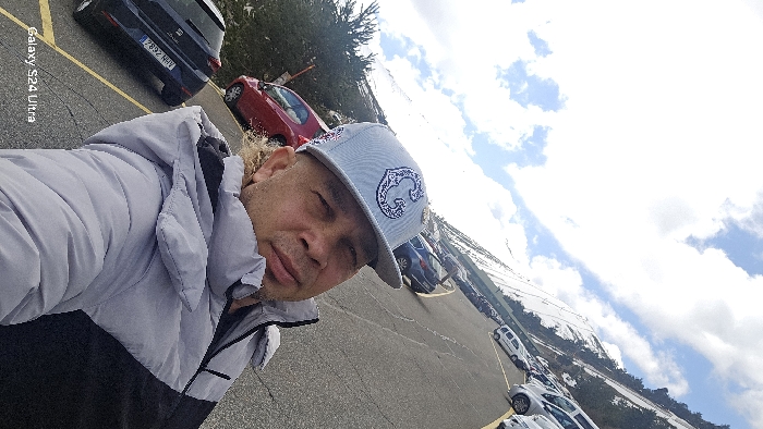 The image is a diagonal, low-angle selfie featuring an adult male in the foreground of a mountain parking lot located in Rascafría, Spain