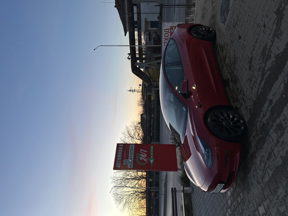 A red Tesla Model 3, bearing Bulgarian license plate E8135 AB, is parked on a paver-tiled surface during twilight hours, indicated by the gradient blue, pink, and orange sky