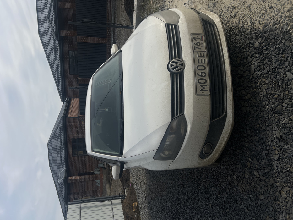 A white Volkswagen Polo sedan, facing slightly right of center, occupies the foreground, parked on a surface of grey gravel