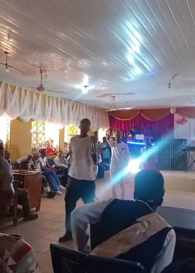 Inside a spacious, well-lit room, a performance unfolds on a stage, with an audience seated and watching attentively