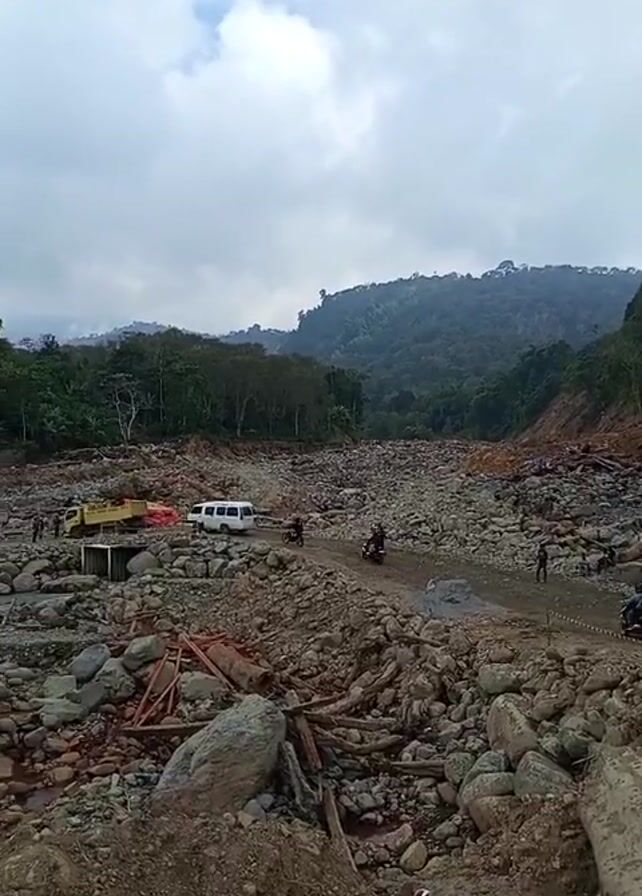 n area filled with rocks and debris, appearing to be a dried riverbed or a landslide area. There are several vehicles present, including white vans and a yellow truck. People can be seen moving around, indicating some activity in the area. The surrounding environment includes lush green trees and hills, suggesting a natural or rural setting. The sky is overcast, contributing to a somewhat somber or uncertain atmosphere. The overall scene suggests a location where some kind of event, possibly natural disaster or extensive construction work, has taken place.