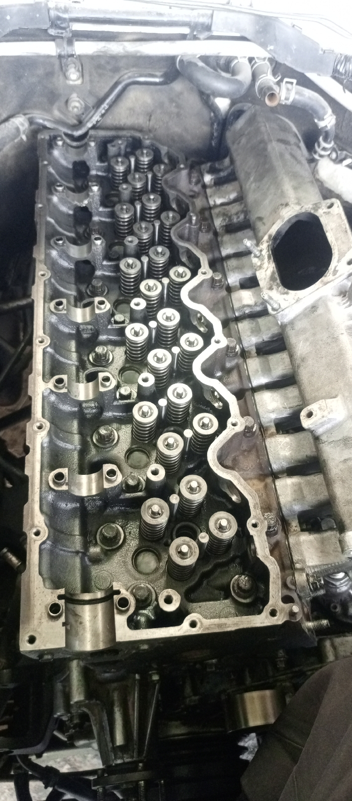The image presents a detailed overhead view of a partially disassembled internal combustion engine, consistent with a vehicle undergoing maintenance in an automotive workshop environment. The primary subject is the engine's cylinder head, with the valve cover removed. Visible components include multiple rows of valve springs with their retainers, and numerous rocker arm pedestals, some secured by bolts. Oily residue is present across the metallic surfaces, indicative of an operational engine. To the right, a section of an intake or exhaust manifold is discernible, featuring a rectangular port and two threaded studs. In the upper background, several hoses and metal pipes are connected to adjacent engine components. The lower portion of the frame shows additional engine hardware, including a metallic bracket and a circular pulley or tensioner. A dark fabric, likely part of a worker's clothing, is visible in the bottom right corner, suggesting active human involvement in the engine's repair. The specific location within Nairobi, Kenya, cannot be determined from the visual information provided in the image.