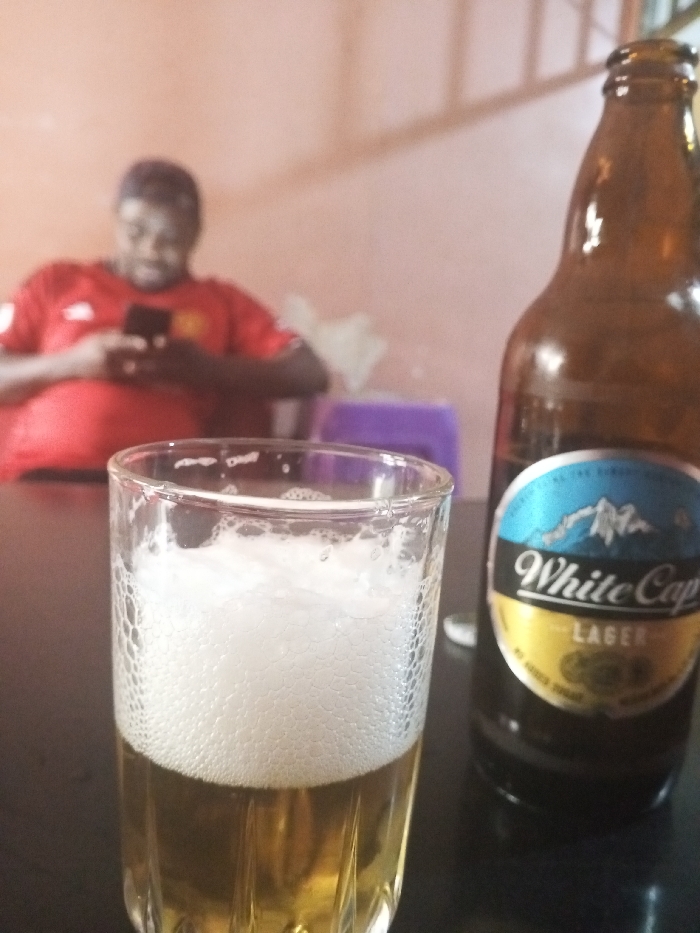 This image depicts an indoor scene located in Kisii Central ward, Kenya. In the immediate foreground, a clear glass filled approximately two-thirds with a golden-colored liquid, topped by a thick layer of white foam, rests on a dark, flat surface. To the right of the glass, a brown glass bottle, clearly identifiable by its label as "White Cap Lager," stands on the same surface. The bottle's label features a blue segment with a white mountain motif, and "White Cap" printed in white, with "LAGER" in gold. In the blurred background, a dark-skinned individual, presumed male, is seated. He is wearing a red short-sleeved shirt and is actively engaged with a black smartphone, which he holds with both hands and looks down at. The background wall behind the individual is a plain, light orange color. A small purple object, possibly a stool or container, is partially visible to the right of the individual and behind the beer bottle. A vague white object is also discernible in the left background, near the individual's left side. A light-colored, possibly metallic or wooden, structural element is visible in the upper right portion of the background. There is no observed interaction between the visible subjects or objects beyond their arrangement within the scene.