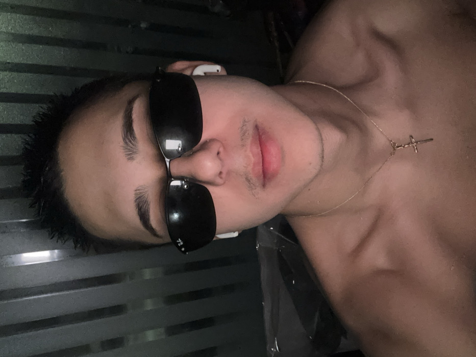 A male individual is depicted in a frontal, chest-up portrait taken in Kostinbrod, Bulgaria. He has short, dark, spiky hair, dark eyebrows, and a light mustache. He wears dark-tinted sunglasses with a visible "Ray-Ban" logo on the left lens, and white wireless earbuds are inserted into both ears. The subject is shirtless, and a thin gold chain with a small gold crucifix pendant hangs around his neck. The background features dark, vertically oriented panels or blinds, with a subtle reflection from an indistinct transparent surface visible on the left side of the frame. The lighting suggests a direct front source. The individual maintains a direct gaze towards the camera.