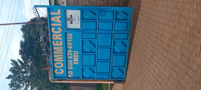 blue metal gate with a sign that reads "COMMERCIAL" in yellow letters, "P.O BOX 639-60100" in white letters, and "EMBU" in white letters. The gate is located at coordinates -0.541, 37.452, in Embu, Kenya. The gate is made of metal panels with square and diamond-shaped cutouts. There is a smaller sign on the right side of the gate, which has a logo of a truck and the words "COMMERCIAL" in yellow letters. The gate is closed. The ground in front of the gate is made of red brick pavers. There are trees on the left side of the image. The sky is clear and blue. The photo was taken in broad daylight.
