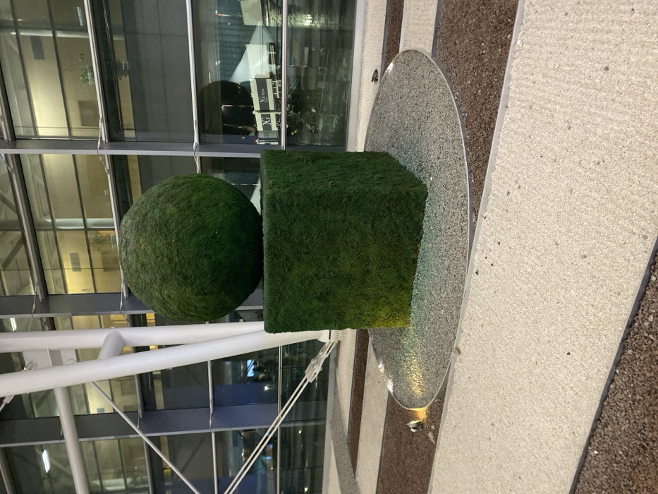 A green sphere and cube stand together in front of a glass-walled building supported by white structural beams. The geometric shapes rest on a reflective oval, which sits on a tiled floor of alternating light and dark materials. The building's facade reflects interior lighting and details of furniture and signage, creating a complex background for the natural shapes.