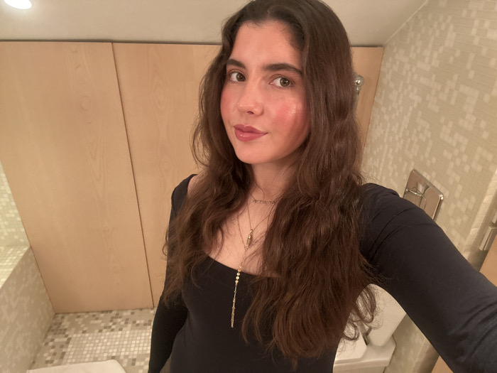 A woman with long, wavy brown hair wears a black long-sleeved top and gold necklaces. She is in a bathroom with light-colored wood cabinets and mosaic-tiled walls and floor. A mirror and a toilet are visible in the background. The woman is facing the camera, with a slight smile and rosy cheeks. The lighting is soft and warm.