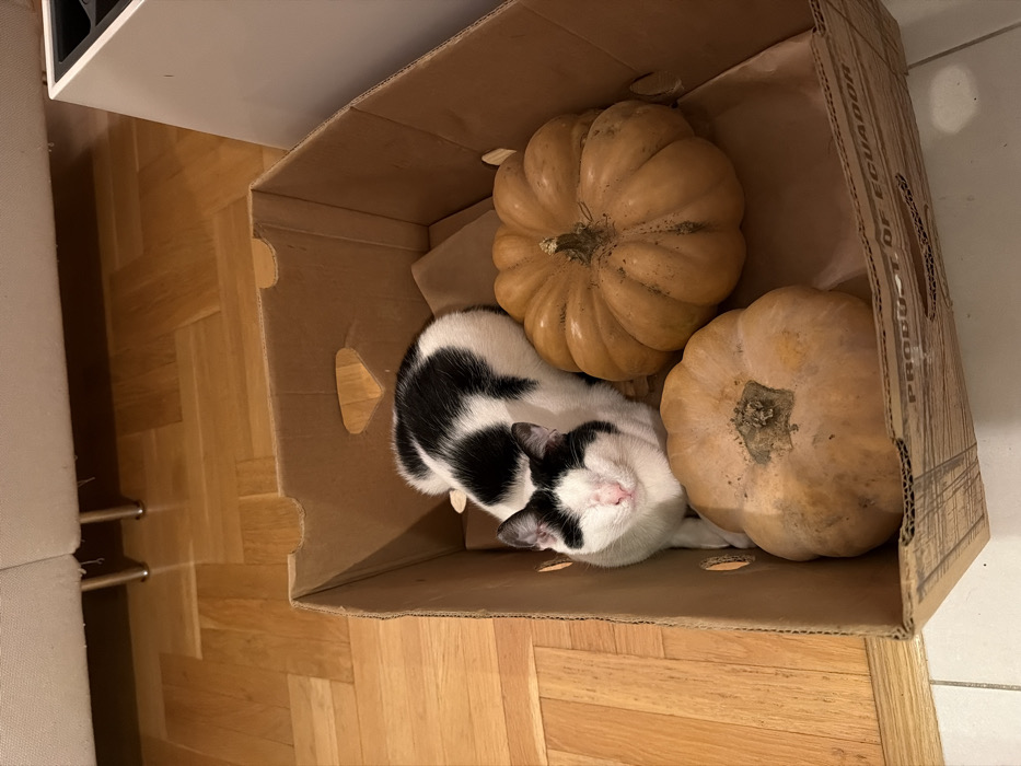 - "An indoor scene in Boreti, Montenegro, displays a black and white cat resting inside a brown cardboard box, positioned on a light brown paper lining" by FM-0Olrx1, licensed under CC BY 4.0