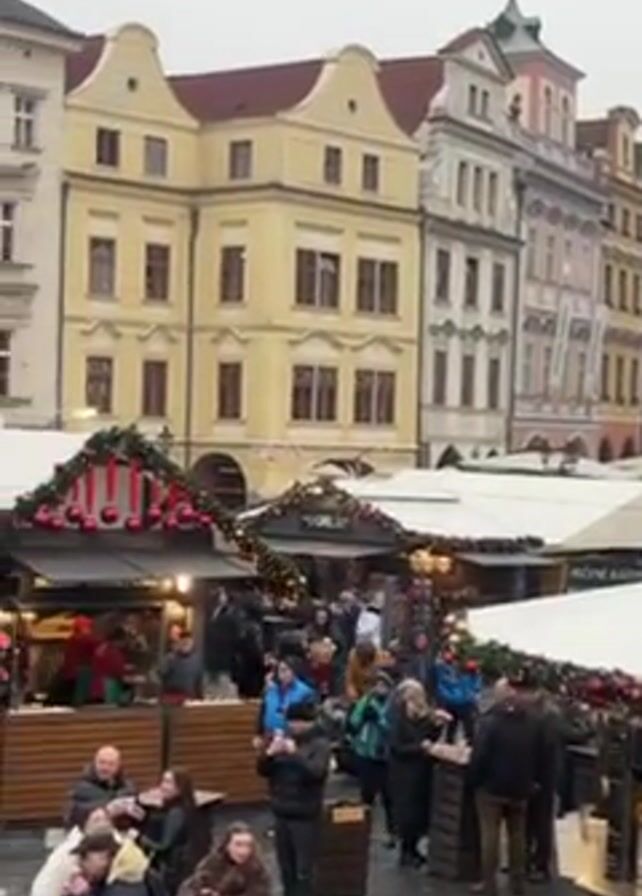n outdoor Christmas market in a European city. There are numerous booths with white canopies, decorated with evergreen garlands and red ornaments. People are browsing the booths, eating, and talking. The buildings surrounding the market are old and made of stone in a variety of colors like yellow, gray, pink and white. The sky is overcast.