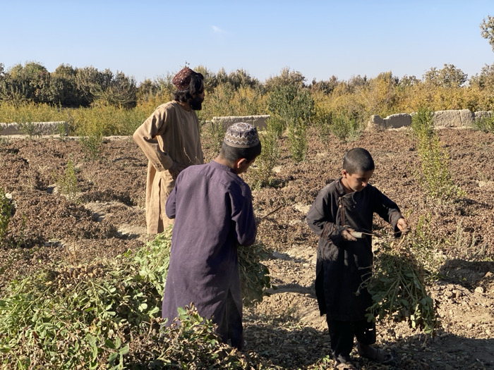 Three individuals, an adult and two children, are present in a field. The adult stands in the background, while the children are in the foreground, actively harvesting. The field contains crops, likely nuts, as evidenced by the vegetation and soil appearance. The sky is clear, suggesting a daytime scene. The group is dressed in traditional clothing, with the children holding tools for harvesting. The setting has trees and some walls visible on the landscape.