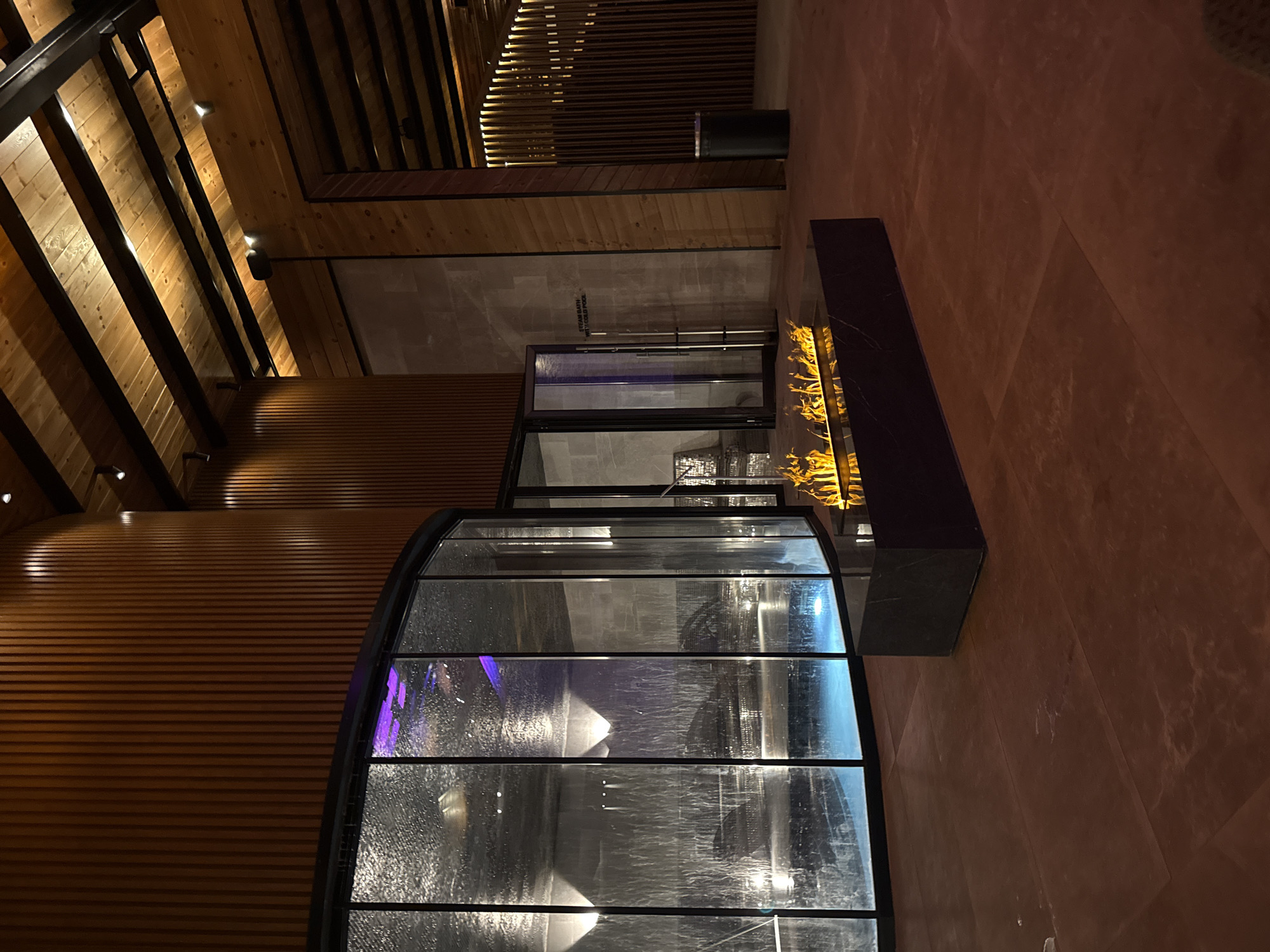 The image displays the interior of a modern wellness facility in Bania, Bulgaria. A prominent curved glass enclosure on the left houses a pool with light blue illuminated water, featuring a visible internal waterfall effect cascading down the glass. Dark lounge chairs are discernable inside the enclosure behind the falling water. In the mid-ground, a rectangular black stone or marble structure functions as a gas fireplace, emitting bright yellow and orange flames. The flooring consists of large, reddish-brown tiles, exhibiting scattered water marks. The walls on the left and background are paneled with vertical wooden slats. To the right of the glass enclosure, a set of partially open double glass doors lead to an adjacent area, marked by a sign on a grey wall reading "STEAM BATH WITH COLD POOL." Further right, a large architectural pillar and a vertically slatted, backlit wooden wall are visible. The ceiling is characterized by exposed wooden beams and planks with integrated spotlights. No individuals are present in the scene. A black cylindrical waste bin is situated in the right mid-ground.