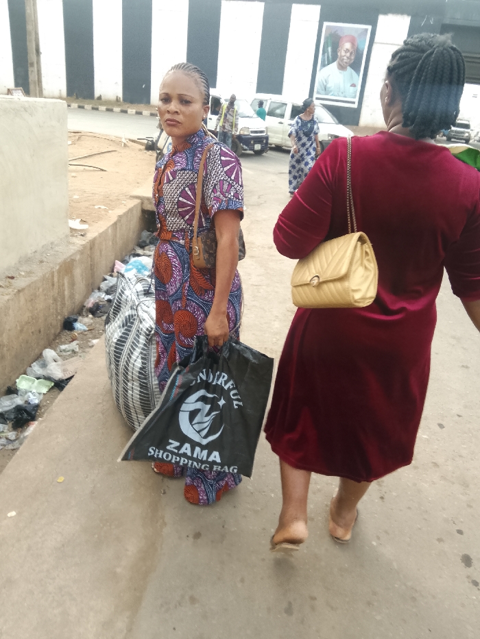 Two women walk along a street with trash strewn nearby. The woman on the left faces forward, wearing a colorful patterned dress, carrying a handbag, and a black “Zama Shopping Bag.” Beside her, a large striped bag rests on the ground. The second woman, seen from behind, wears a deep red velvet dress and carries a light-colored purse. Further in the background, other figures and vehicles are visible under an overpass with a billboard.