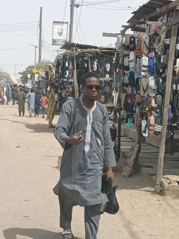 An outdoor scene in Hotoro South, Nigeria, depicts a bustling street market under clear daylight. In the foreground, a dark-skinned male, approximately 20-30 years old, walks towards the viewer. He wears dark sunglasses, a grey traditional tunic with white embroidery, matching trousers, and striped open-toed sandals. He holds a small, dark object in his raised left hand and a black plastic bag in his right hand. To his immediate right, a makeshift market stall displays numerous pairs of sandals, slippers, and flip-flops of various brands and colors, hanging from wooden structures and ropes under a corrugated metal roof. A black motorcycle is partially visible behind the man, positioned near the stall. In the midground and background, an unpaved road extends into the distance, populated by multiple individuals, including adults and children, walking away from the camera. Utility poles with overhead power lines and a billboard featuring a bearded man's portrait with the text "TAFAWA" are visible further down the street. A yellow sign for a "SERVICE CENTER" is also discernible. The ground is dusty earth, and sparse vegetation appears in the background.