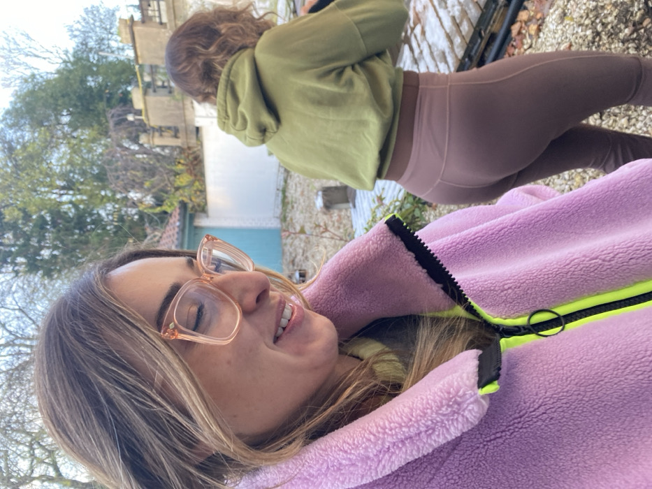 The image displays two individuals outdoors, likely within a residential garden or backyard in Lille, France. In the foreground, a woman with medium-length brown hair and large, light peach-colored square-frame glasses is positioned from the chest upwards. She appears to be looking downwards with a subtle smile and is wearing a fuzzy, light purple fleece jacket with a neon yellow zipper and black trim. Behind her, partially obscured, a second woman is seen from the upper back to mid-thigh, facing away from the viewer. She has wavy brown hair and is dressed in an olive green hooded sweatshirt and form-fitting, brownish-mauve leggings. The background features a low white wall, a building with a red tiled roof and a light blue door, and additional stone architectural structures. Deciduous trees with sparse foliage suggest a cool season, and white patches consistent with snow or frost are visible on a surface to the right of the background woman's feet.