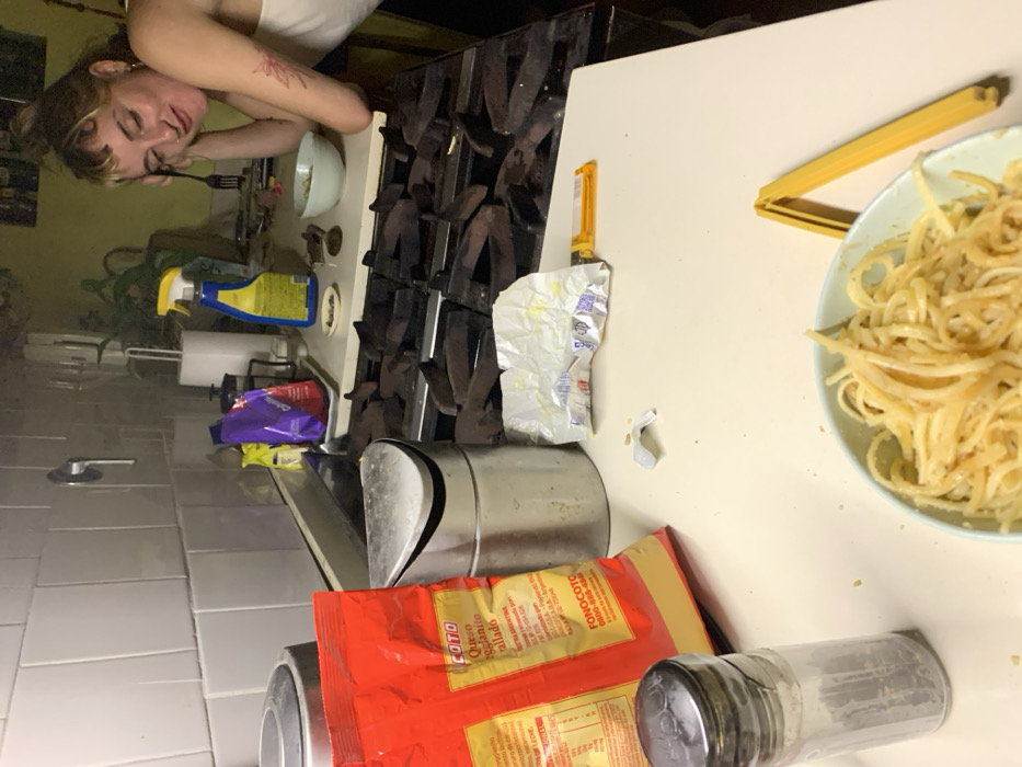 The image depicts a kitchen scene in Buenos Aires, Argentina, identified by a red bag of "Coto Queso Rallado" (Grated Cheese) visible on the countertop, "Coto" being a prominent Argentine supermarket chain. In the foreground, a light blue bowl contains cooked spaghetti or linguine, seasoned with a light sauce and possibly grated cheese. To the left of the bowl, a transparent salt shaker with a silver top stands upright. Further left, a large red and yellow bag of Coto-brand grated cheese is partially visible, oriented vertically. Beside it, a silver, two-tiered container with a curved black accent line sits on the counter. A crumpled aluminum foil wrapper is near the center, and an orange disposable lighter rests to its right. A yellow plastic bag clip is positioned near the pasta bowl on the right. The midground features a gas stovetop with six black, heavy-duty grates, suggesting an industrial or robust home appliance. The stovetop appears unlit. In the background, a young female with light-colored hair, pulled back with bangs, is seen leaning against the countertop on the right side of the frame. She wears a white sleeveless top and has a red-ink tattoo on her left upper arm. Her left hand supports her head, and she smiles faintly, looking downwards towards the pasta bowl. A small, light blue bowl containing food, possibly matching the one in the foreground, is positioned in front of her. Behind her, a blue and yellow spray bottle, a white paper towel roll holder, and various small items are on a shelf or counter against a light green wall. White tiled walls are visible in the upper left background. The overall lighting is dim, suggesting an indoor evening setting.