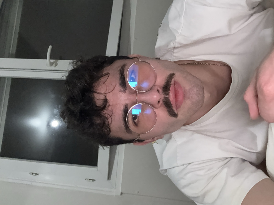 A man with curly dark hair and a drawn-on mustache poses with round glasses. The glasses reflect a blue light source. He is wearing a white t-shirt and a thin chain necklace. He is positioned to the right side of the frame, with a white-framed window visible to the left. The room appears dimly lit.