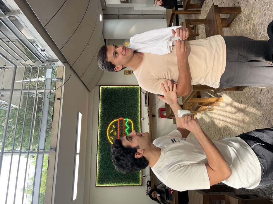 The scene depicts an indoor area, identified as being in Porto Salvo, Portugal, likely a cafeteria or casual dining space. Two adult males are central to the foreground. The male on the left has dark curly hair, wears a light-colored t-shirt with a graphic print, and dark jeans. He holds a small white espresso cup in his right hand and places his left hand on the right bicep of the male next to him. His mouth is slightly open, suggesting speech or reaction, and he looks towards the other male. The male on the right has short dark hair, wears a beige t-shirt, and dark grey pants. He holds a small white espresso cup in his left hand, with a white towel draped over his left shoulder. He looks slightly towards his right (viewer's left) with a subtle smile. In the mid-ground, a large rectangular wall panel is covered in artificial green turf, featuring a neon light outline of a hamburger with yellow, red, and green elements. A long, linear fluorescent light fixture is mounted on the ceiling above this panel. To the far left, a female figure with dark hair is seated at a wooden table, engaged with an electronic device, and has a cup in front of her. To the far right, a partial figure shows a hand pointing towards the central male on the right. The environment includes numerous light-brown wooden tables and matching benches arranged throughout the room. The floor is tiled with an irregular, light-colored stone pattern. Natural light enters from an unseen upper window or skylight on the left, casting distinct striped shadows across the floor. An upper mezzanine level with metal railings and exposed structural beams is visible towards the top of the frame. A dark rotary phone and a red object are visible on a shelf along the back wall.