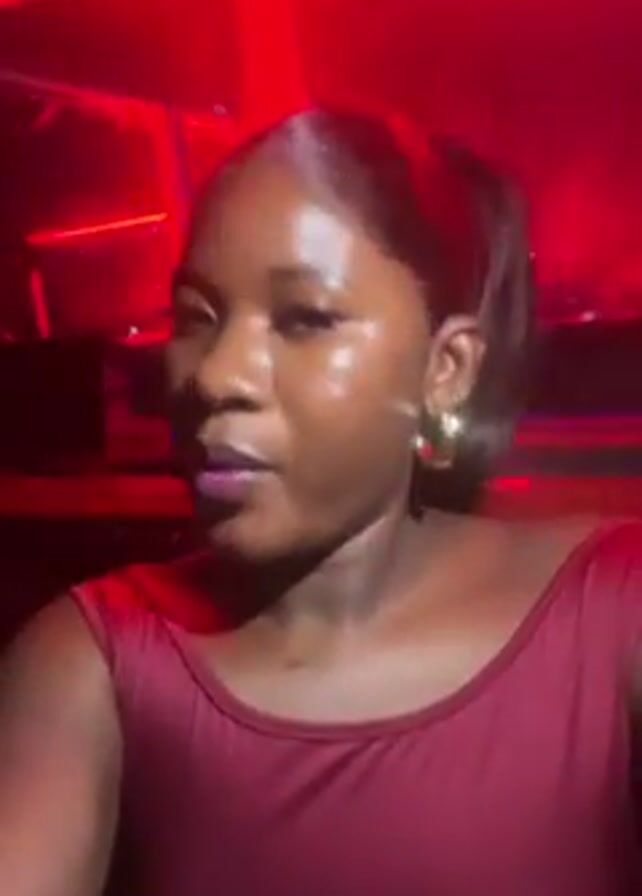 woman in a dark red top with a scoop neck. She has dark skin, dark hair slicked back, gold hoop earrings, and is wearing dark pink lipstick. The lighting changes between bright red and dark with city lights in the background. The music is loud and sounds like some type of electronic music.