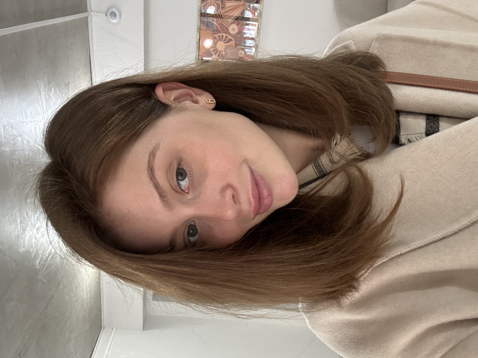 The image displays a close-up of a single female subject in an indoor setting. The subject has shoulder-length auburn hair, light-colored eyes, and a faint smile directed towards the camera. She wears a beige, possibly woolen, collared coat over a black and white plaid garment. A small, gold-colored, oval-shaped stud earring is present in her right ear. A brown leather strap, consistent with a handbag, is visible over her right shoulder. The background features a white wall, with a framed abstract artwork visible to the subject's right, depicting concentric and geometric shapes in muted orange, brown, and cream tones. The ceiling above is light grey with a textured, possibly concrete, finish. The environment is evenly lit. The scene is located indoors in Tbilisi, Georgia.