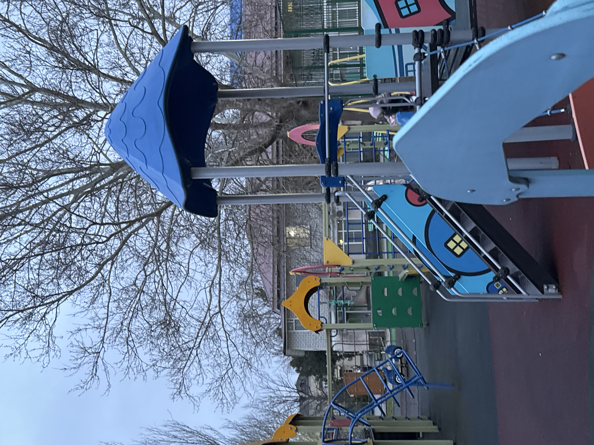 The image depicts a playground in Anapa, Russia. The playground features a variety of colorful play structures including a blue covered platform, slides, climbing structures, and various obstacles. The sky is overcast and there are bare branches of a tree visible above the playground equipment. A building is present in the background. The ground of the playground appears to be a combination of dark and red surfaces. The playground appears to be deserted.