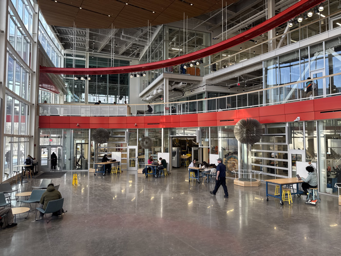 An expansive interior space with abundant natural light. People are seated at tables, engaged in various activities. A man in a mask walks across the polished floor. Above, red accents highlight the architectural structure. Multiple levels with glass partitions create visual depth. The space appears to be a modern academic or communal area. Unusual, spiky spherical art pieces punctuate the room.