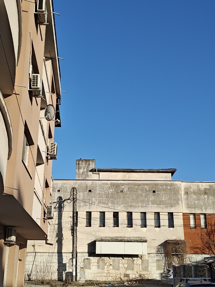 An exterior, vertical-format photograph depicts an urban scene under a clear, bright blue sky, illuminated by direct sunlight from the left. The left third of the image is occupied by the facade of a light brown or tan multi-story building, presenting a smooth finish with some architectural curves. This building features multiple rectangular windows and at least four external air conditioning units mounted below windows. A small, grey satellite dish is affixed to the facade near the center-left. The right two-thirds of the image is dominated by a larger, older building with a weathered, light grey or off-white facade, exhibiting discoloration and a grimy appearance. The upper section of this building has a flat roofline, with a taller concrete structure, possibly a chimney or vent shaft, visible on its left side. Below this, the wall contains several small, square vents. A row of seven uniformly sized, dark-framed rectangular windows is present across the mid-section of the wall. Below these windows, a large, rectangular, blank white sign structure is mounted. The lower portion of the wall shows textured, possibly concrete block, material with darker patched areas. The far right section of this building's facade is red brick at the base, transitioning diagonally upwards to a lighter orange-tan material, and includes two windows similar to those on the grey section. Dead or dormant vines are visible clinging to the right side of this facade. In the mid-ground, a dark utility pole with numerous attached wires runs vertically, casting a long, distinct shadow across the weathered building behind it. At the base of the pole, a small grey electrical box is present. The ground area between the buildings appears unpaved, consisting of dirt or gravel with sparse, dry vegetation and scattered debris. A dark metal fence is partially visible on the far right, behind which the top of a light-colored vehicle, possibly an SUV, can be seen. The location is identified as Unknown, Unknown. No individuals are present in the scene.