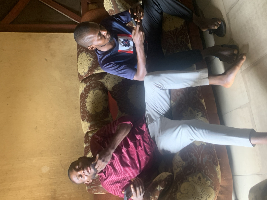 Two adult males are seated on a patterned brown and beige sofa inside a building in Okene, Nigeria