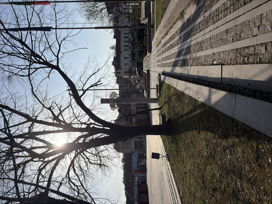This daytime image depicts a public square or park area in Lom, Bulgaria, under a clear sky with strong, low-angle sunlight from the left, casting prominent shadows. A large, bare deciduous tree with a thick, dark trunk and intricate branch structure is silhouetted against the sun in the mid-left. To its immediate right, a modern streetlight features multiple circular lamp heads radiating from a central pole. A strip of green grass, interspersed with long shadows, borders a paved walkway that runs from the mid-right foreground towards the background. This walkway consists of alternating light-colored concrete and darker, possibly cobblestone, sections, creating a striped pattern. A concrete curb separates the grass from the walkway. In the left background, a large, empty paved plaza with a few small, dark, kiosk-like structures is visible, bordered by a line of low-rise buildings with varied light-colored facades. In the right background, several tall flagpoles stand erect; one displays a dark blue flag, and another shows a flag with visible vertical stripes of green, white, and red. Beyond these, traditional multi-story buildings with tiled roofs and windows line what appears to be a street or a continuation of the plaza. One building exhibits a light yellow facade. No individuals, vehicles, or discernible activities are present in the scene. The environment appears quiet and unpopulated.