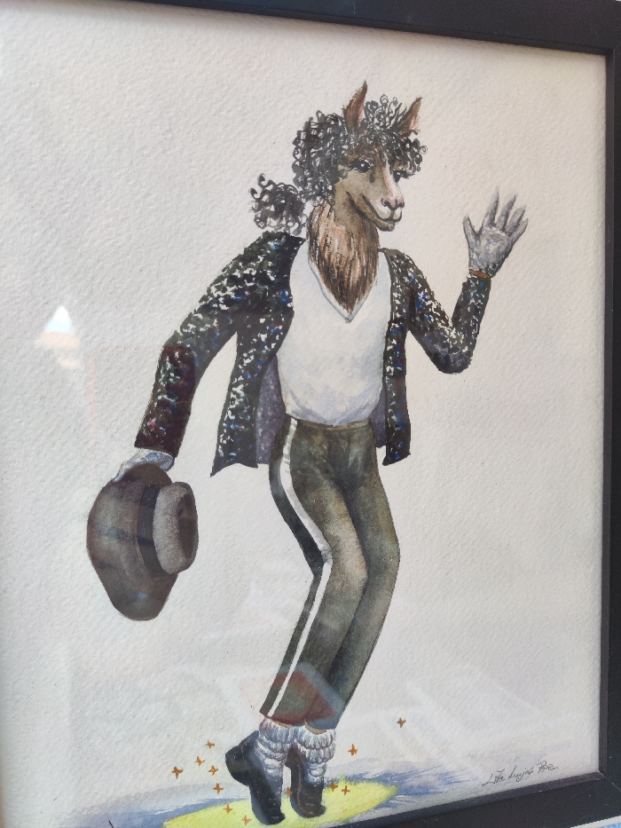 A framed watercolor painting features a llama dressed as Michael Jackson