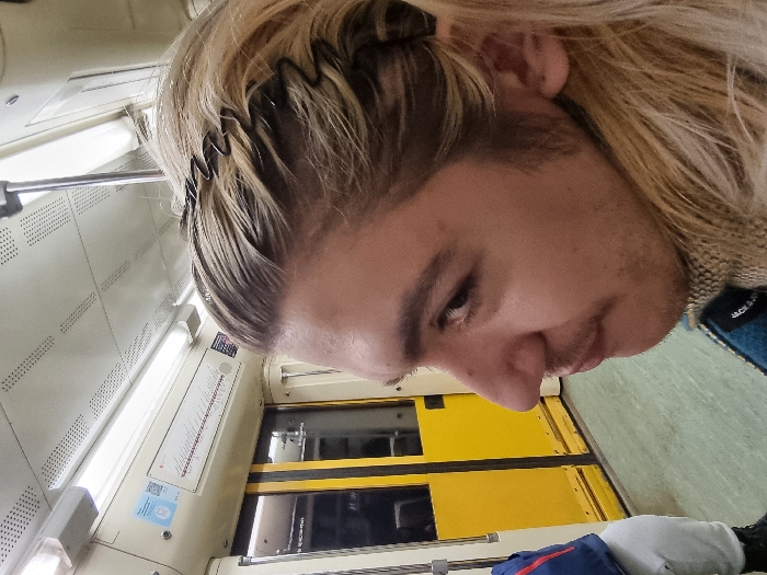 - "A person with blond hair and a black zig-zag headband is seen from a close, angled perspective, likely inside a train or bus" by FM-u6qup2, licensed under CC BY 4.0