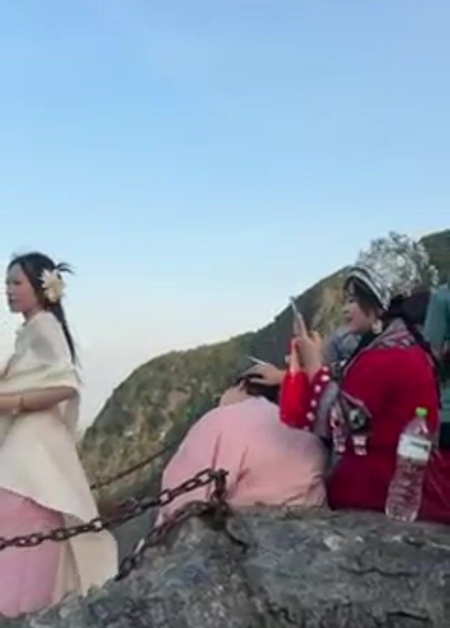 Three young women are on a rocky outcrop, appearing to pose for pictures. One woman is standing, wearing a light cream-colored top, a long pink skirt, and a flower in her hair. She is holding what appears to be a small bunch of light-colored flowers or sweets. Another woman is sitting on the rocks, wearing a pink outfit. The third woman, sitting next to the pink-clad woman, is wearing a traditional red outfit and an elaborate silver headdress. She is taking pictures with her smartphone. A water bottle sits next to her. A thick metal chain runs in front of the women. In the background, a mountain covered in greenery and a clear blue sky can be seen.