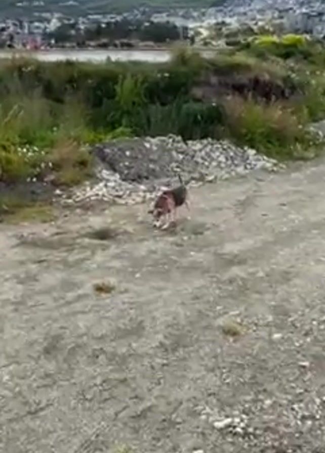 beagle dog with a pink collar on a dirt ground. The background is a landscape with mountains covered in snow, water and a town. There is a lot of vegetation surrounding the dirt ground. The sky is cloudy. The dog appears to be sniffing the ground.