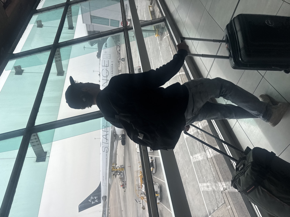 An individual is depicted inside a terminal at Lyon-Saint Exupéry Airport (LYS) in Colombier-Saugnieu, France, looking out a large, multi-pane window. The person, viewed from behind, is wearing a dark baseball cap, a dark long-sleeved top, light grey jeans, and light-colored boots. A dark backpack is worn on their back. They are holding the extendable handles of two pieces of luggage: a dark olive green wheeled duffel bag on the left and a black hard-shell wheeled suitcase on the right. Outside the window, on the tarmac under an overcast sky, an Air Canada wide-body aircraft, bearing "STAR ALLIANCE" branding on its fuselage and the Star Alliance logo on its tail, is parked. Ground support equipment, including mobile stairs and yellow service vehicles, is positioned near the aircraft. A portion of a jet bridge is visible to the right of the aircraft's nose. The interior floor is composed of light-colored tiles, and the windows are framed by dark structural elements, creating a grid pattern.