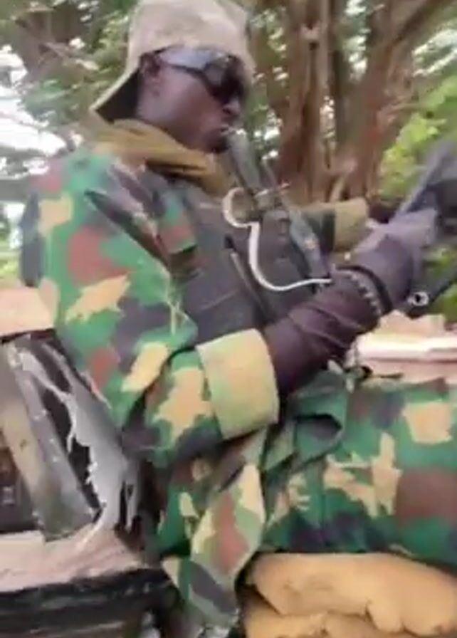 person wearing camouflage clothing, sunglasses, and a cap, sitting and holding a large gun, with what appears to be ammunition belts visible. The person also seems to have a radio communication device attached to their clothing. They are sitting on what looks like a padded cushion, and the background includes trees and possibly a building or structure in the distance. The setting appears to be outdoors.