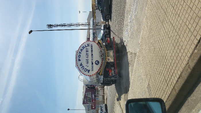 The scene depicts an industrial area within the Polígon Industrial De Calvià, Spain, under a bright, partly cloudy blue sky. A large white tanker truck, viewed from the rear, occupies the center-right of the image. The truck's cylindrical tank features the text "AGUA POTABLE" (Potable Water) in blue, a phone number "608 638 097", and "TRANSPORTE DE AGUA A DOMICILIO" (Water delivery service to homes). The vehicle has a red rear bumper, visible taillights, and mud flaps, with a partially visible Spanish license plate. The ground directly behind and around the truck appears wet and reflects light, indicating standing water or a recent wetting event on a paved surface of cracked concrete or asphalt. To the right of the truck, two passenger vehicles, a dark sedan and a grey SUV, are parked or stationary. In the background on the left, a multi-story commercial or industrial building with red trim and numerous windows is visible. On the right, a tall, black lattice-style telecommunications tower stands alongside a street light. The immediate foreground shows a section of light-colored, square-patterned pedestrian paving and the dark blue housing of a vehicle's side mirror, from which the photograph was taken. No individuals are visible.