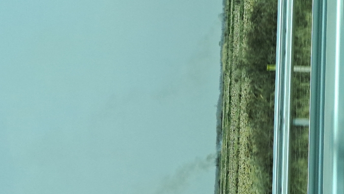 The image depicts an expansive outdoor landscape in the vicinity of Pazardzhik, Bulgaria, likely viewed from a moving vehicle on a roadway. The foreground is dominated by a three-tier metallic guardrail, exhibiting motion blur. Immediately behind the guardrail is a strip of dense, low-lying green-brown vegetation, also blurred. The midground features extensive agricultural fields with light green to yellowish-brown ground cover or low crops, appearing in segmented patterns. From multiple points within these fields or at their distant edge, several distinct plumes of dark grey smoke are observed rising vertically against an overcast, light blue-grey sky. A faint tree line is visible along the distant horizon. No people, animals, or identifiable structures are present.