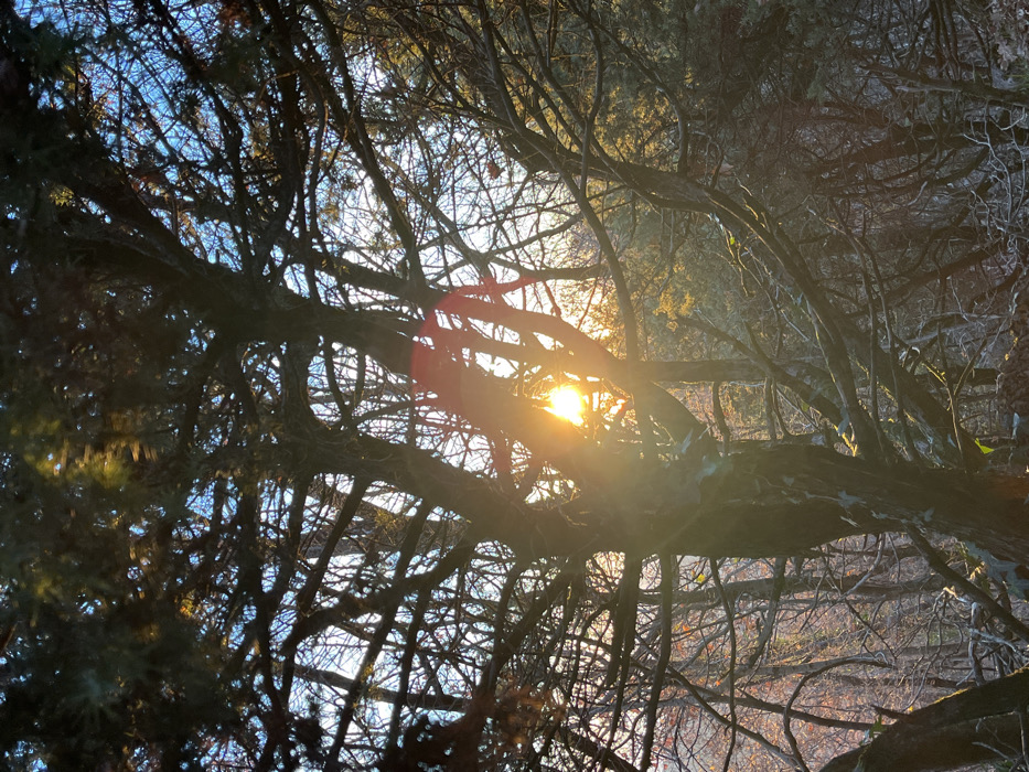 A tangled network of tree branches fills the frame, obscuring the sky. Sunlight bursts through the branches, creating a bright focal point in the center. The branches are silhouetted against the light, showing varied textures and patterns. Some branches are thick and horizontal, while others are thin and reaching upwards. The scene has a natural, wild quality, with a mix of light and shadow.