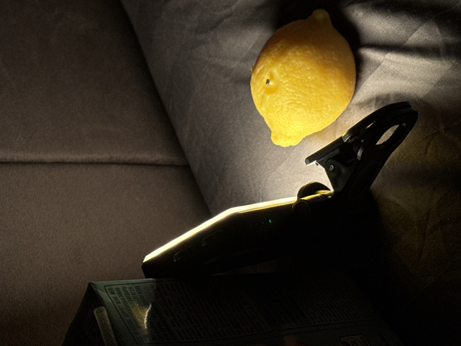 The image displays an indoor, dimly lit scene. A black, activated clip-on LED light emits a focused yellowish-white beam onto a dark gray, textured fabric surface, possibly a bed or sofa. A small green indicator light is visible on the clip-on light's casing. To the left, partially within shadow, stands a dark-colored carton or box with fragmented white Cyrillic text visible on its side under the illumination, including words possibly in Kazakh. To the right of the light's beam, a single, whole yellow lemon with a dimpled skin rests on the fabric surface, exhibiting a small dark spot on its upper side. The background consists of an upright brown upholstered surface, likely a headboard or sofa back, with a vertical seam. No individuals or specific identifying architectural or environmental features are present to determine an exact location within Krasnodar, Russia.