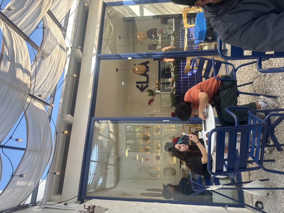 Outdoor seating area of a cafe with blue chairs. People are seated at tables, enjoying their meals. There is a woman and a person with an orange shirt and green pants sitting together. The cafe's interior is visible through the large glass windows, revealing decorative elements and the word "ELAYA" in large letters. A canopy of light-colored fabric hangs above the seating area. The overall atmosphere is casual and relaxed.